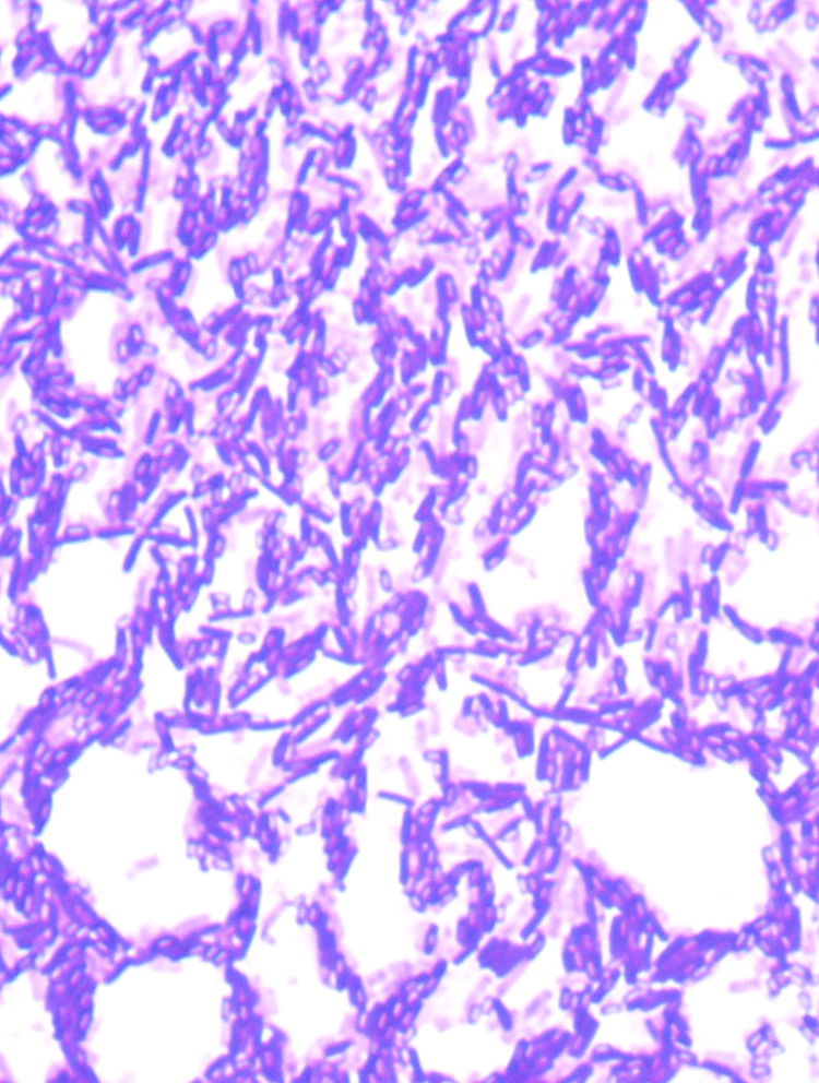 【生物特征】地衣芽孢杆菌MES816革兰氏染色呈阳性,细菌呈直杆状,单个、成对或短链排列。有芽孢,芽孢近椭圆形,中生,芽孢囊不膨大;在营养琼脂培养基上的菌落微黄色,形态不规则,扁平,不透明,在光照下菌落边缘较中央略透明,表面湿润、有光泽,向边缘扩张。