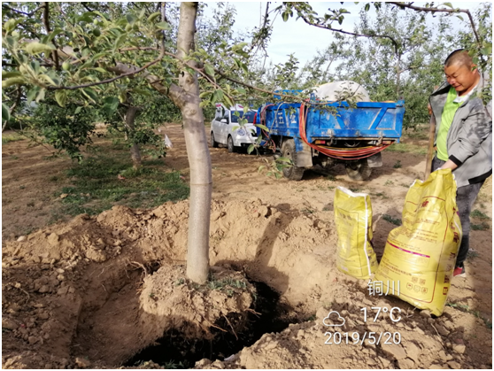 使用方法:从苹果树树冠滴水线开始往树干处开沟,见到根为止,去除腐烂的根系,使用坤益健腐熟蛋白生物有机肥20斤配合坤益健调酸补钙2斤均匀撒施在施肥沟里,和土搅拌均匀,再使用坤益健100菌剂100ml兑水30-50斤,进行浇灌,然后覆土。